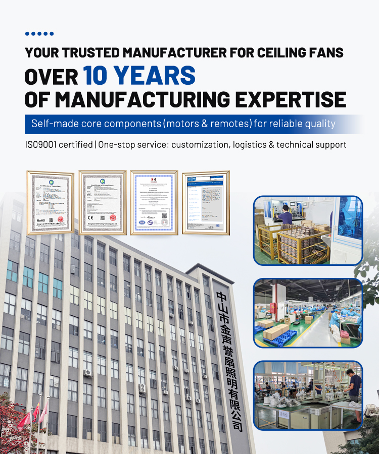 Founded in 2010 and situated in Henglan Town, Zhongshan City—a recognized core hub for China’s electrical and lighting industry—Zhongshan Jinshengyu Fan Lighting Co., Ltd. (JSY) stands as a professional manufacturer specializing in remote control switches, inverter motors, and ceiling fan lights. To