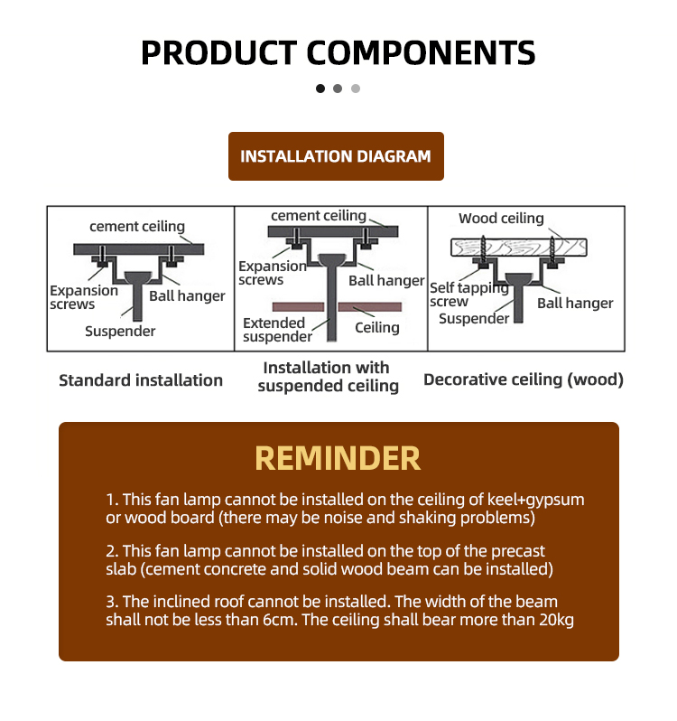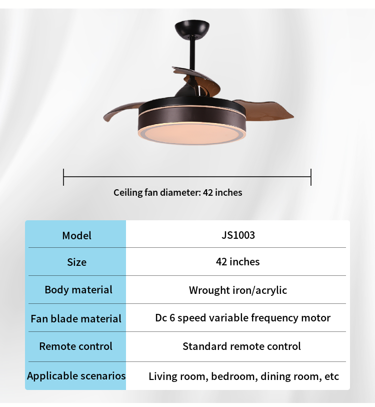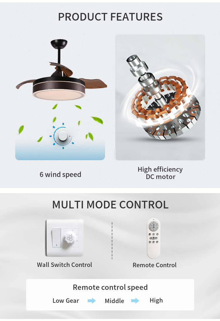 | Feature | 3 color light、low noise、6 speed、remote control、natural wind、forward/reverse、timer function、energy conservation |