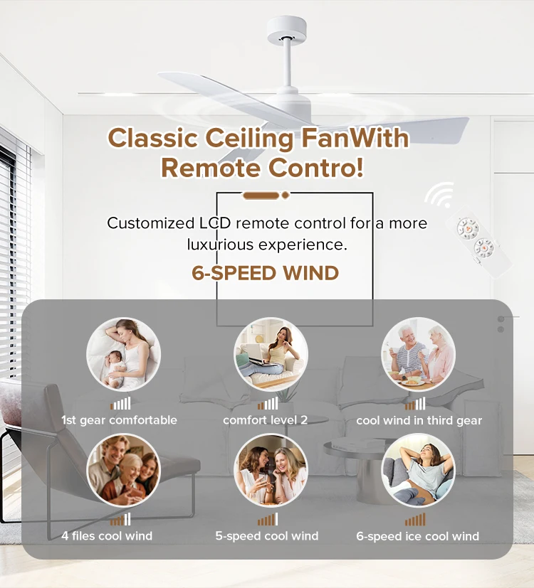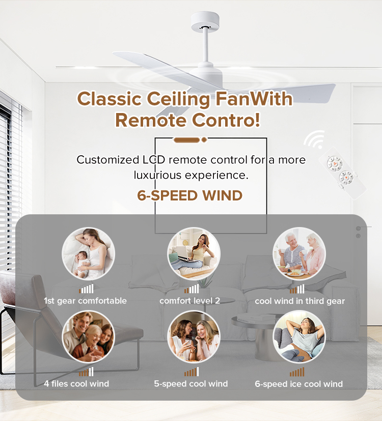 | Feature | 3 color light,low noise,6 speed,remote control,natural wind,forward/reverse,timer function,energy conservation |