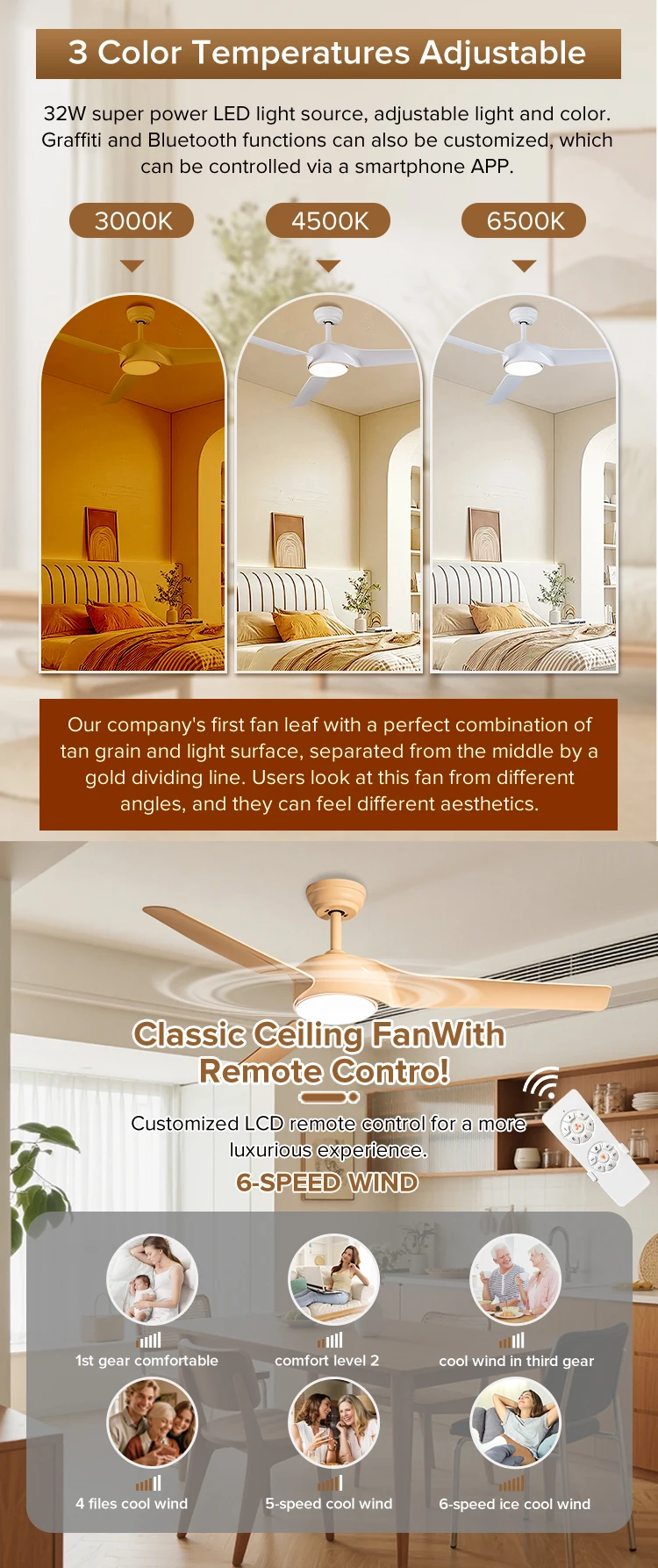 | Feature | 3 color light,low noise,6 speed,remote control,natural wind,forward/reverse,timer function,energy conservation |