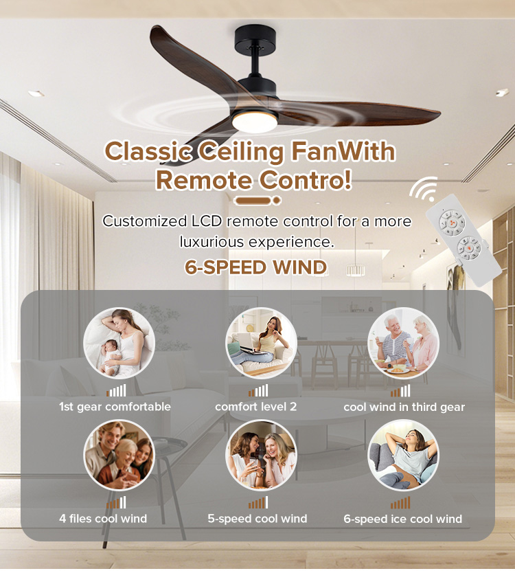 | Feature | 3 color light,low noise,6 speed,remote control,natural wind,forward/reverse,timer function,energy conservation |